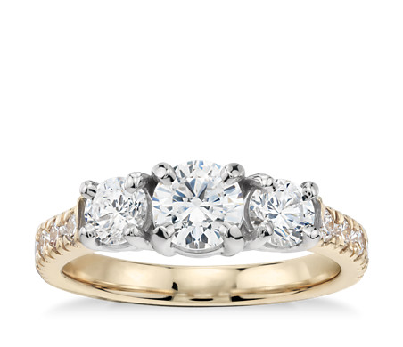 Classic Three-Stone Pave Diamond Engagement Ring in 18k Yellow Gold